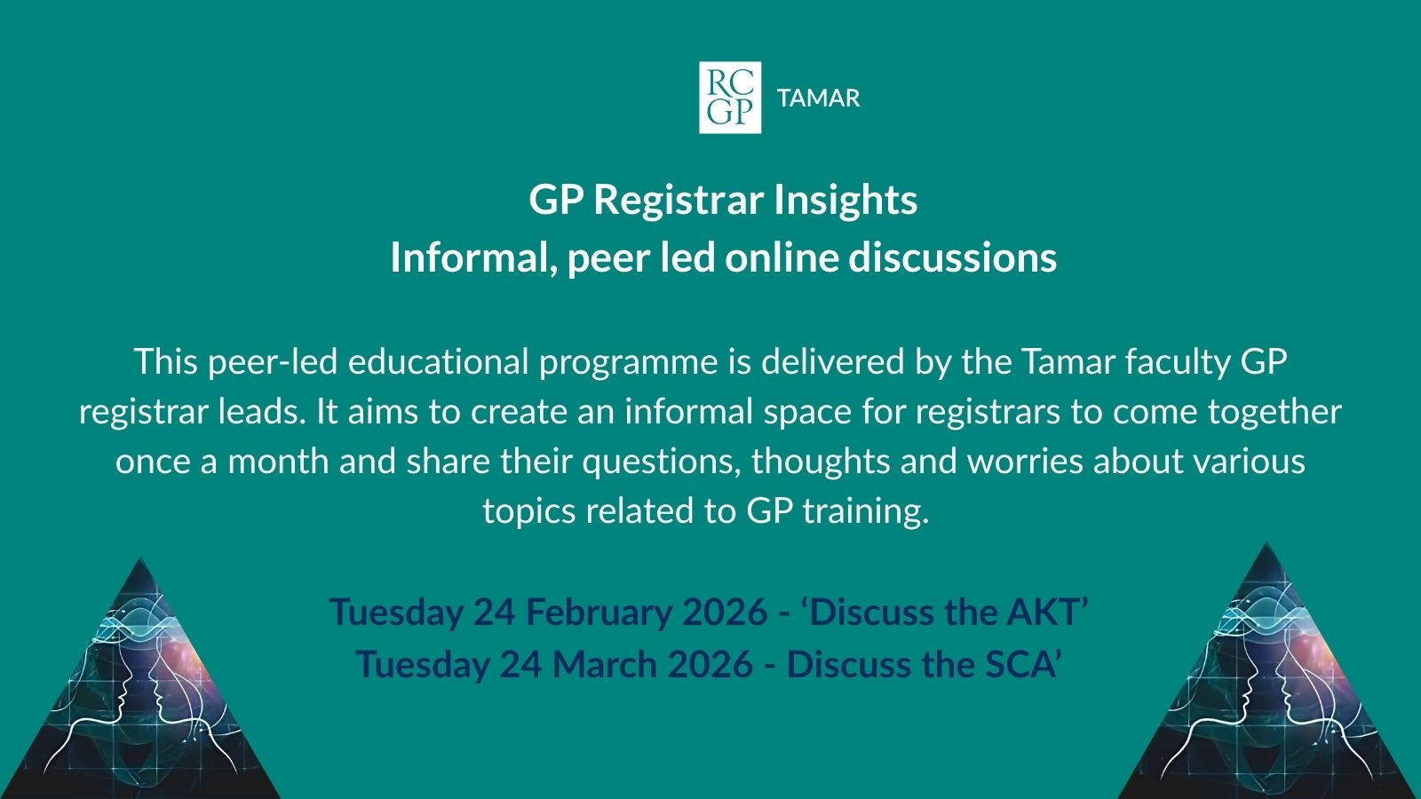 The Tamar Faculty GP Registrar Leads invite you to join their peer-led educational sessions, open to all GP Registrars, which aims to create an informal space for registrars to come together and share their questions thoughts and worries about various topics related to GP training.